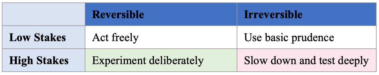 When you combine stakes and reversibility, you get four kinds of decisions.